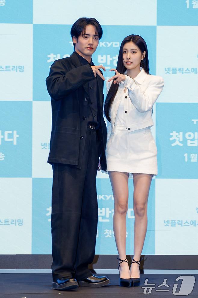 (서울=뉴스1) 안은나 기자 = 배우 아카소 에이지(赤楚衛二)와 강혜원이 7일 서울 구로구 더세인트에서 열린 일본 테레비 도쿄(TV TOKYO) 드라마 '첫입에 반하다'(김밥과 오니기리, 사랑하는 두 사람은 닮았지만 다르다) 제작발표회에 참석해 포즈를 취하고 있다.