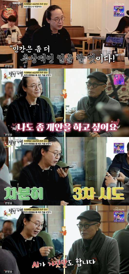 하지만 AI가 틀린 정보를 주자 당황한 송길영은 “이거 아니다. 다시 하겠다”라며 2차 시도를 했다. 말까지 더듬으며 질문하는 송길영에 웃음이 터진 허영만은 “그런데 답이 아닌 건 어떻게 알았냐”라고 물었다.