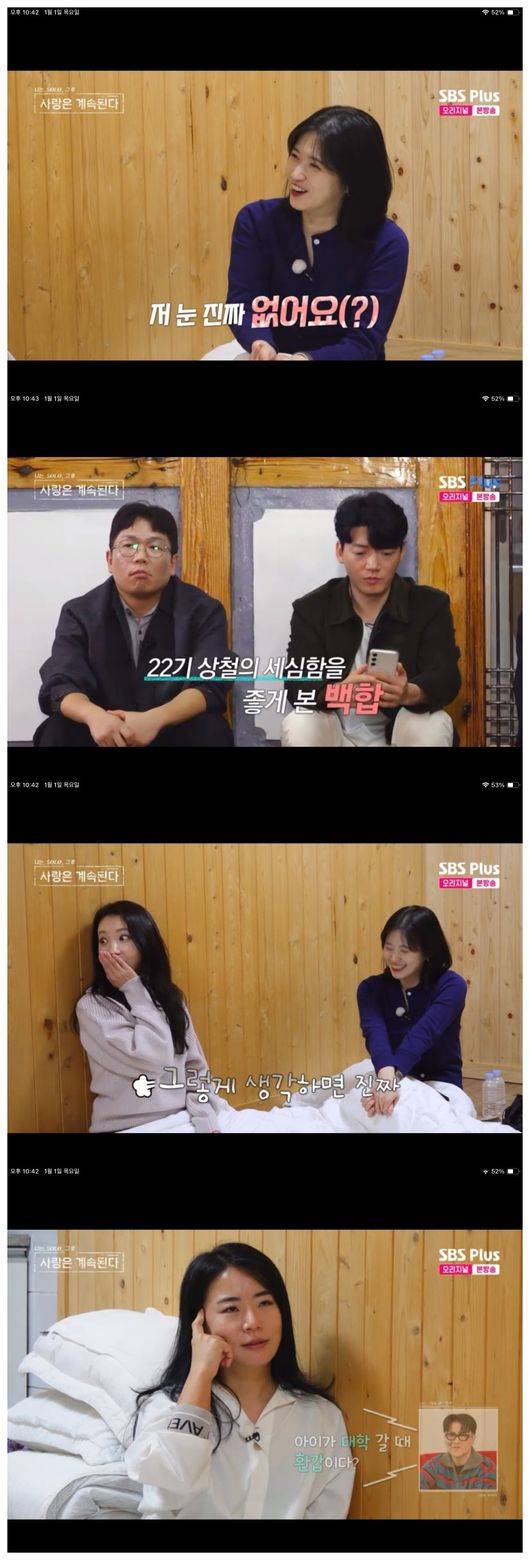 이에 22기 상철은 “아, 그랬냐. 나는 상대방이 자기 합의 이혼했다고 떵떵거리고 살 거 같아서, 소송 이혼으로 진행했다. 그때 나는 괜찮은 줄 알았는데 머리에 구멍이 나더라”라며 말했고, 두 사람은 오래도록 이야기를 나눴다.