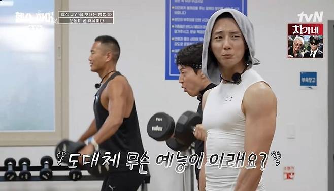 추성훈 루틴으로 운동을 하기로 한 멤버들은 세트당 20개씩 진행하는 어깨 운동을 시작했다. 17kg 덤벨부터 점점 낮은 무게로 진행한다고. 추성훈부터 힘겹게 덤벨을 드는 멤버들을 보며 정대세는 "뭔가 사이비 종교 같다"고 말했고, 윤시윤은 "도대체 무슨 예능이 이러냐. 내가 뭐 하고 있는 거지?"라고 혼란스러워했다.