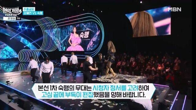 6일 방송된 '현역가왕3'에서는 숙행을 최소 편집, '승패가 있는 경연의 특성상, 결과에 대한 이해를 위해 부득이 숙행의 무대를 분량 축소해 방송됨을 양해 바랍니다'고 밝혔다.