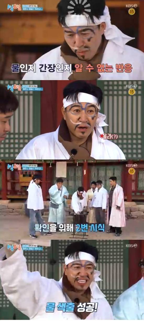 김종민은 "미쳤나봐. 역대급이다"라며 투명한 간장 사이에서 어떻게 물을 골라야 할지 난감해 했다. 문세윤은 "이거 맞히면 신이다"라고 기대감을 드러냈다.