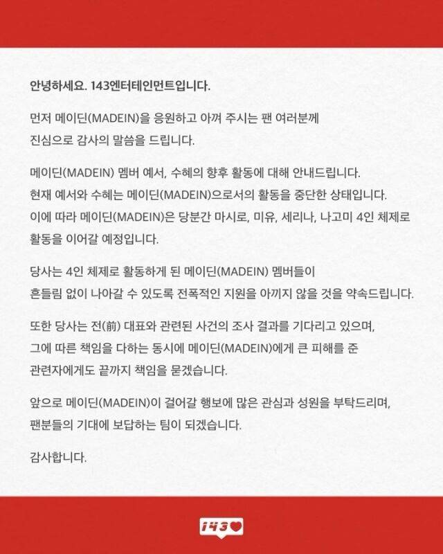 그러면서 "당사는 前 대표와 관련된 사건의 조사 결과를 기다리고 있으며, 그에 따른 책임을 다하는 동시에 메이딘에게 큰 피해를 준 관련자들에게도 끝까지 책임을 묻겠다"고 덧붙였다.
