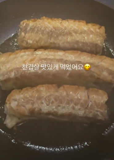 영상에는 천겹살이 팬에서 익어가는 모습이 담겼다. 이는 지난 27일 방송된 MBC 예능 프로그램 '전참시'에서 이영자가 현빈에게 선물한 천겹살.