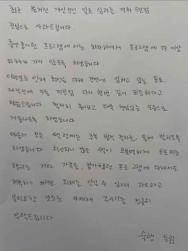 다만 그는 "아울러 모든 사실관계는 추후 법적 절차를 통해 밝히도록 하겠다"며 "확인되지 않은 사실이 무분별하게 유포되는 행위는 저와 가족들, 참가했던 프로그램에 대해서도 회복하기 어려운 피해를 안길 수 있으니 과도하고 불필요한 보도는 자제해 주시기를 정중히 부탁드린다"고 덧붙였다.