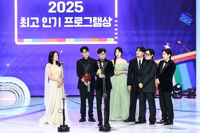 '2025 최고 인기 프로그램상'은 올해도 어김없이 '런닝맨'에게 돌아갔다. 또 SBS 예능 PD들이 직접 뽑은 '프로듀서상'은 버라이어티 부문 남자 수상자로 '런닝맨' 양세찬, 쇼 음악 부문 남자 수상자로 '우리들의 발라드' 전현무가 호명됐다.