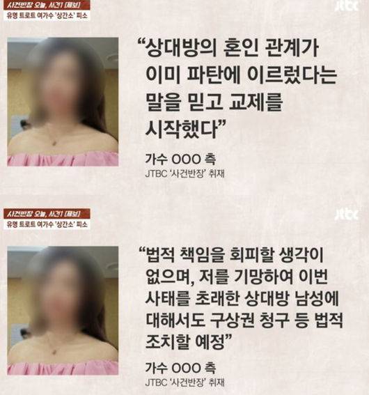 앞서 지난 29일 JTBC 사건반장에서는 유명 트로트 여가수가 유부남과의 불륜 및 동거 의혹으로 상간 소송에 휘말렸다는 제보가 공개됐다. 이후 해당 인물이 숙행으로 밝혀지며 논란은 걷잡을 수 없이 확산됐다.