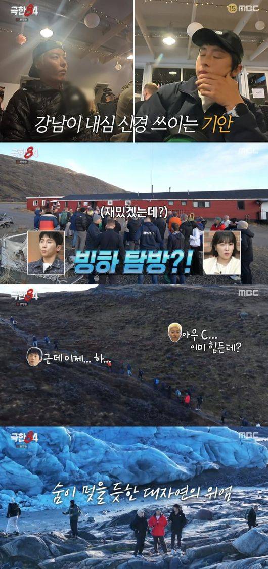 가이드의 설명에 따라 순록, 사향소 등 동물들을 마주한 극한크루는 어딘가에서 하차한 뒤 주최측의 안내에 따라 빙하를 보러 이동했다. 초입부터 오르막길이 시작되고, 살얼음 바닥에 강남은 “이미 힘들다”라고 했다.