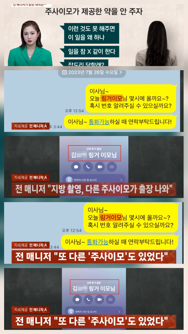 가장 충격을 준 부분은 이른바 ‘주사이모’ 관련 폭로였다. A씨는 잠든 박나래에게 주사이모가 계속 약물을 주입하는 사진을 공개하며 “의사가 맞는지 의심됐고 매우 위험해 보였다”고 말했다. A씨에 따르면 박나래는 “의사 아닌 것 같은데… 또 의사 같기도 하다”고 말한 적이 있다고 했다.