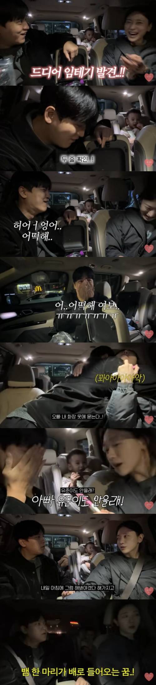 유혜주는 "내가 요즘 느낌이 계속 배가 아팠다. 설마해서 아침에 바로 해봤는데 두 줄이더라. 오빠한테 보여줄까 하다가 지금 보여주는 것"이라고 했고, 남편은 "난 아예 몰랐다. 와 잠이 확 깨네. 내가 운전할게"라며 아내를 걱정했다.
