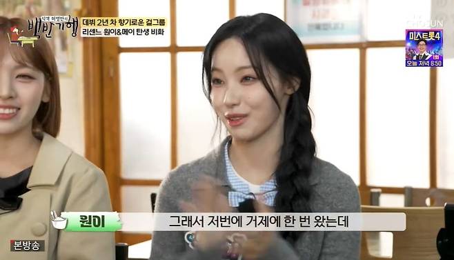 일산 출신인 메이는 "서울 바로 옆 동네에 살아서 많이 왕래를 하면서 오디션을 많이 봤다"고 밝혔다. 이를 들은 허영만이 "거제나 일산이나"라고 하자 원이는 "그쵸? 근데 자꾸 절 놀린다. 거제에 뭐가 있냐고. 여기 거제 시민들이 다 (지켜보고) 있다"라고 큰소리치기도.