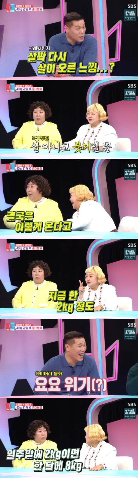 이에 홍윤화는 "지금 살짝 부었고, 흰 옷을 입어서 그렇다"고 했지만, 옆에 앉은 신기루는 "제가 그러지 않았냐. 결국 나처럼 된다고. 뭐하러 살을 빼는지 모르겠다고"고 했다.