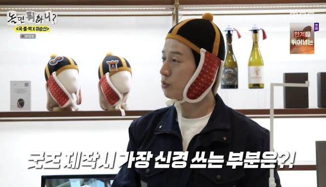 유재석은 시작 전부터 조선 장수들의 전투복 투구에서 착안한 모자에 마음을 빼앗겼고, 허경환과 함께 모자를 쓰고 작업했다. 이어 유재석이 니트 담요까지 걸치자 허경환은 "명품 여러 개 입은 느낌"이라고 밝혔다. 유재석은 허경환의 몸에 담요를 대보며 "넌 덮고 자도 되겠는데? 사이즈 딱이다"라며 적극 추천했다. 허경환은 거북선 미니어처를 들며 유재석에게 "사줘요. 후배 하나 못 사주나?"라고 요구하기도.