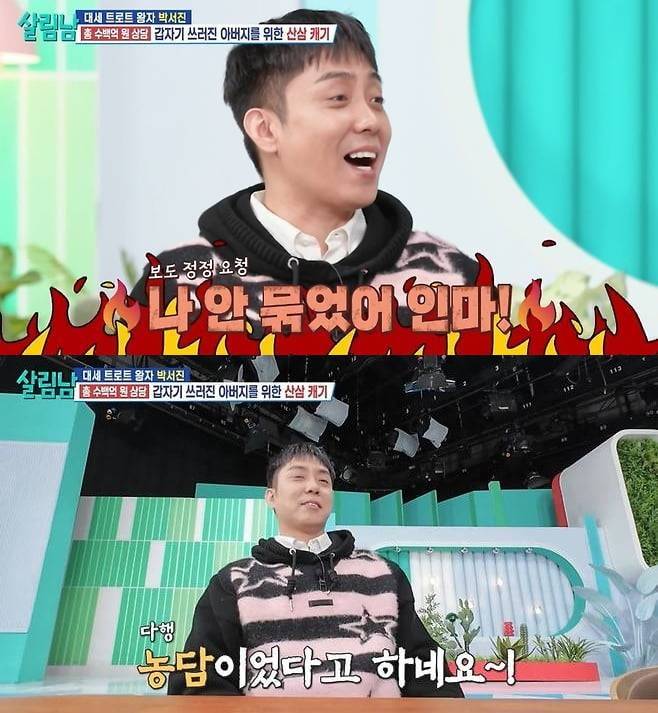이날 박서진은 솔로인 신승태에게 "갔다 와도 몇 번을 갔다 왔을 나이다. 애가 있어도 셋은 있을 것"이라고 말했다. 그러면서 박서진은 “형도 혹시 묶었어요?”라고 은지원을 떠올리는 질문을 했다. 이를 영상으로 보던 은지원은 “나 안 묶었어!”라며 급발진했다. 자막에는 보도 정정 요청이라고 더해졌다.