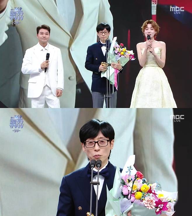 "뭐라고 감사 말씀을 드려야 할지 모르겠다. 부모님께 감사 드린다. 장인어른, 장모님 그리고 늘 고마운 존재인 나경은씨에게 감사하다"라고 소감을 밝힌 유재석은 "하하, 주우재에게도 고맙다는 이야기를 늘 하고 싶다. 아쉽게 하차했지만, (박)진주, (이)미주, (이)이경이까지 너무 고생했고 고맙다"라며 하차 과정에서 잡음이 불거졌던 이이경을 포함한 후배 예능인들에게도 고마움을 표했다.