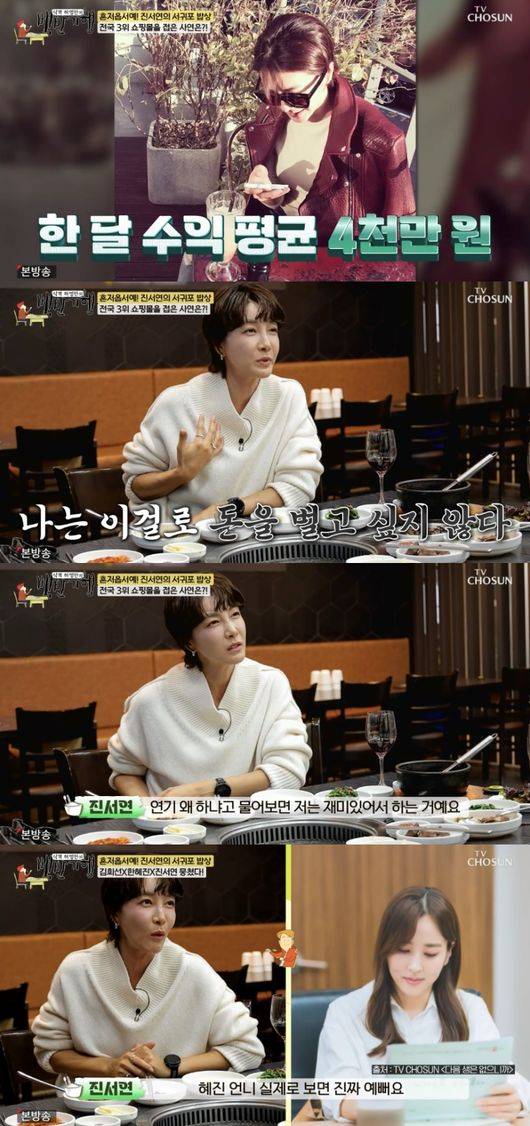 진서연은 “저는 괴롭진 않았다. 왜냐하면 내가 연기 아니면 재미를 느낄 만한 게 있을까 해서 대학교 때 쇼핑몰도 해보고 그랬다. 장사 진짜 잘됐다. 한 달에 4천만 원 벌었다. 되게 많이 벌었다”라고 밝혔다.