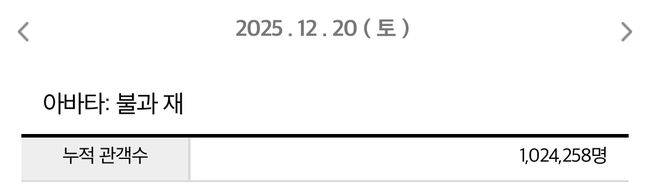 영화 '아바타: 불과 재'가 개봉 4일째인 오늘 누적 관객수 100만을 돌파했다. 영화관입장권 통합전산망에 따르면 '아바타: 불과 재'는 12월 20일(토) 오전 6시 기준, 1,024,258명의 누적 관객수를 동원하며 100만 관객 돌파를 알렸다. 이는 현재 2025년 전체 박스오피스 1위를 기록한 '주토피아 2'와 유사한 시점(개봉 4일째 100만 돌파)으로 폭발적인 화력임을 짐작케 한다.