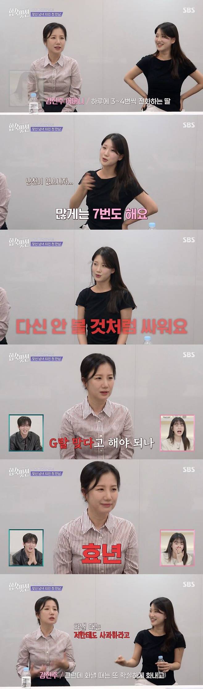 이날 동안 미모의 어머니와 함께 등장한 김진주. 김진주의 어머니는 딸에 대해 "하루에 3,4번씩 전화하는 딸이다. 많게는 7번도 한다"라며 난감해했다.