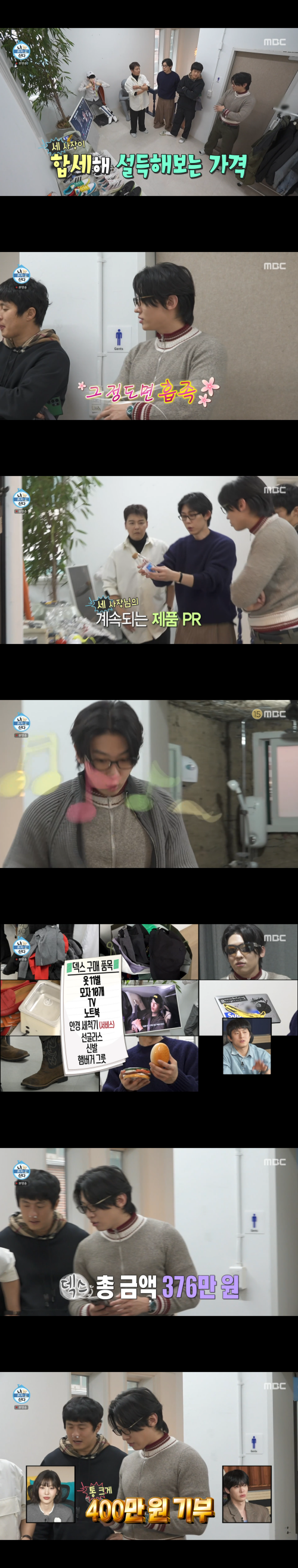 평소 물건을 잘 사지 않는다고 밝혀왔던 덱스는 이날 기부 취지에 공감한 듯 옷을 시작으로 다양한 아이템을 고르며 순식간에 바자회의 ‘큰손’으로 떠올랐다. 옷 11벌과 모자 10개를 비롯해 TV, 노트북, 선글라스 등 수많은 물품을 한아름 담았고, 총 구매 금액은 376만 원에 달했다. 덱스는 “좋은 일에 쓰는 거라서”라며 통 크게 400만 원을 입금해 박수를 받았다.
