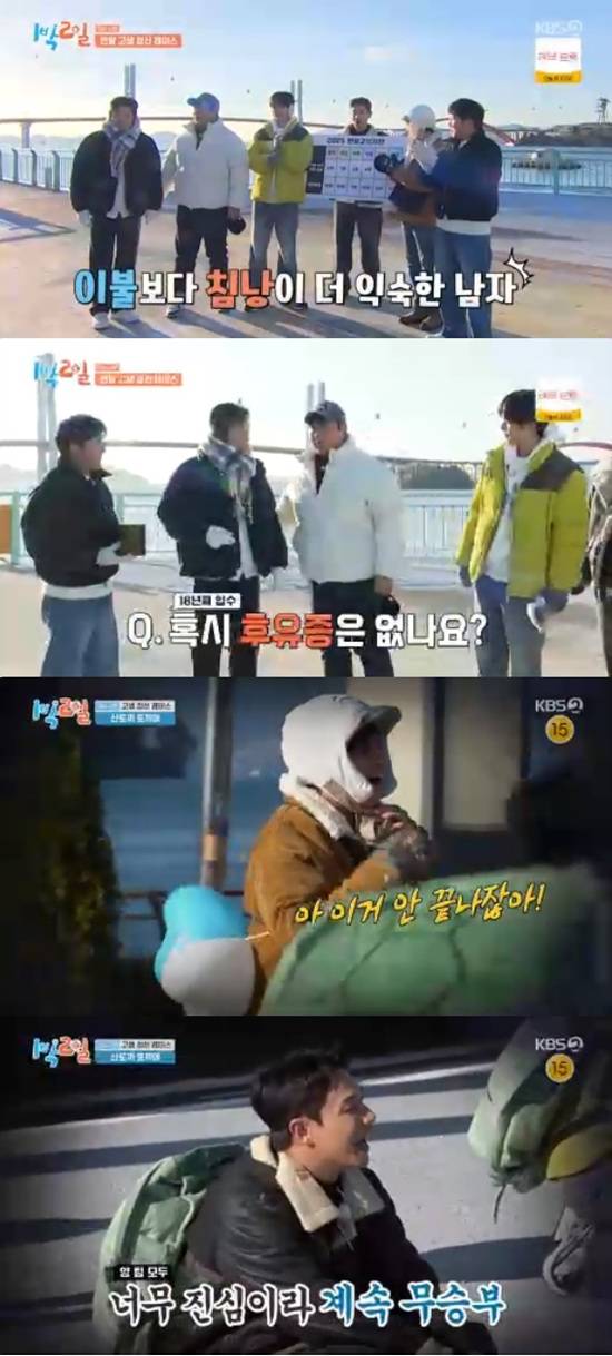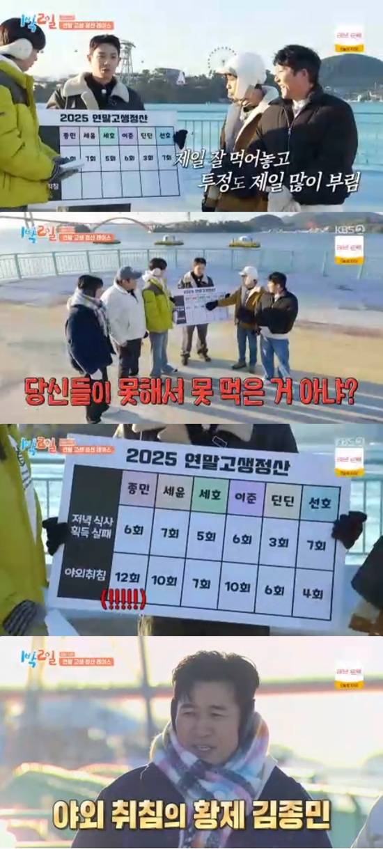 '고생왕' 김종민, 올해 야외취침 최다 "24번 중 12번이나...입 돌아가겠다" (1박 2일)[종합]