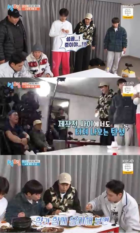 멤버들은 1단계 단합공기 미션에 성공한 뒤 2단계 미션으로 냄새만으로 3개의 김치 종류 맞히기에 도전했다.