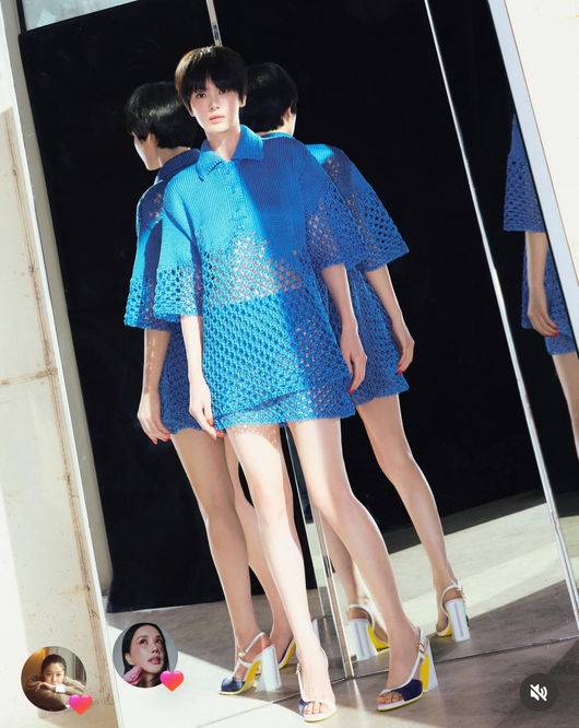 또한 두꺼운 직물로 코를 크게 뜬 투피스는 송혜교의 흰 피부가 얼마나 새파란 색을 잘 받는지 알 수 있으며, 이를 소화하는 데도 무리가 없다는 것을 보였다. 또한 적당한 높이의 뮬을 신은 송혜교의 모습은 키를 생각하지 못하게 완벽한 비율을 자랑하고 있었다.