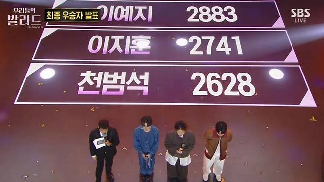 이지훈은 현장 탑백귀 투표에서 2741점을 얻으며 홍승민, 최은빈, 송지우를 제치고 1위에 올랐다.