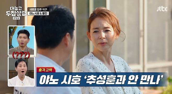 이날 장동민과 일본 톱 모델이자 추성훈의 아내 야노시호가 새로운 입주 식구로 등장했다. 장동민은 "여긴 원래 부부가 나오는 건데, 왜 (추성훈과) 같이 안 왔느냐"고 물었고, 야노시호는 "안 만난다"라고 고백했다. 장동민도 "형수님 어디 있냐니까 연락 안 한다고, 모른다더라"라면서 연락을 안 하는지 물었다. 이에 야노시호는 "가끔 한다"라며 "우리 부부, 프리 스타일"이라고 답했다.