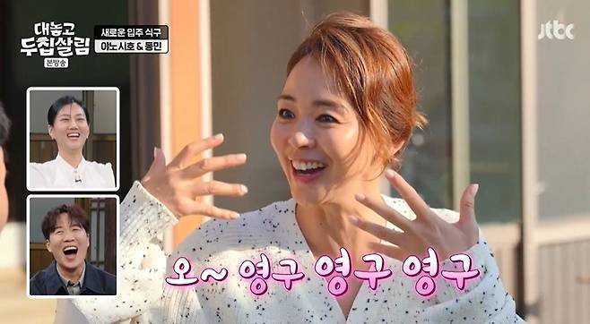 장동민이 "실제로 뵈니까 더 미인"이라고 칭찬하자 야노시호는 "피부가 반짝반짝거린다"라며 "영구 보인다"라고 화답했다. 야노시호는 49세, 장동민은 47세였고, 장동민 나이를 들은 야노시호는 "영구, 영구"라고 했다. '영구'는 젊다란 뜻으로 말한 것이었다. 제작진이 '영구'가 뭔지 알려주자 야노시호는 당황하며 "몰랐다. 미안하다"라고 웃었다.
