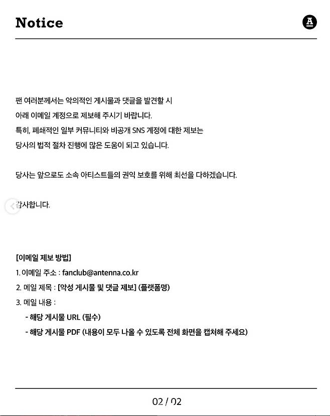 또한 안테나는 "폐쇄적인 일부 커뮤니티와 비공개 SNS 계정에 대한 제보는 당사의 법적 절차 진행에 많은 도움이 되고 있디"며 악성 게시물 및 댓글 제보를 요청했다.