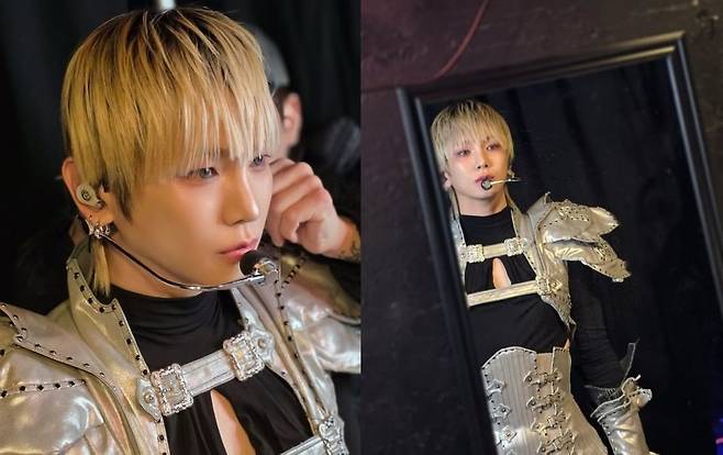 공개된 사진엔 미국투어 중인 키의 모습이 담겼다. 사진 속 키는 무대에 오르기 전 무표정으로 거울을 바라보고 있는 모습으로 연한 금발과 코르셋을 연상케 하는 무대의상으로 화려한 매력을 발산했다.