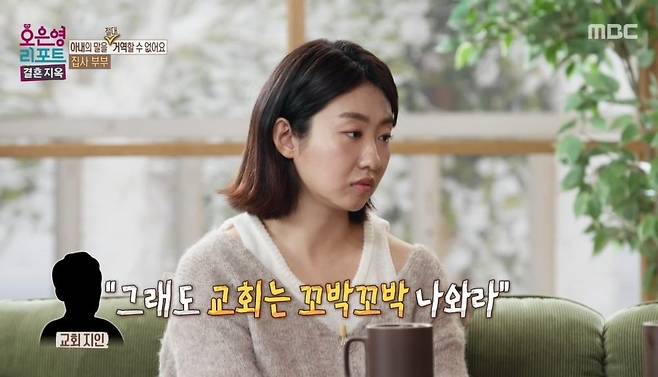 남편은 "처음으로 제가 풀타임 전도사로 일했는데, 교회에선 아내도 모든 예배와 행사에 참석하길 바랐다. 그때 아내가 몸도 아프고 힘든 일도 많아서 (예배에) 늦을 때도 있었다. 아내가 교회 지인에게 힘든 일들을 털어놨는데, 들은 말은 '그래도 교회는 꼬박꼬박 나와라'였다. 당연히 아내는 교회 가는 게 어려워질 수밖에 없었고, 공황장애도 심하게 생겼다"고 밝혔다.