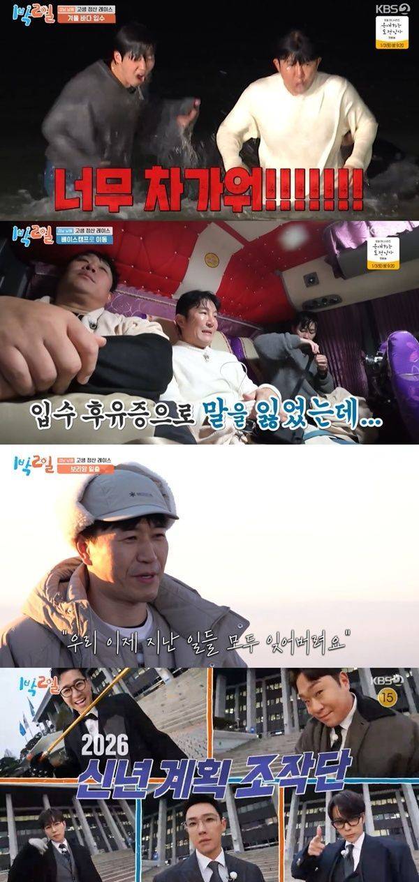 엄동설한 속 세 사람은 바다로 들어가기 시작했고, 딘딘은 두 사람의 손을 잡은 뒤 "2025년도 1박 2일을 사랑해주셔서 감사드리고 2026년도 잘 부탁드린다"라고 외치며 입수했다.