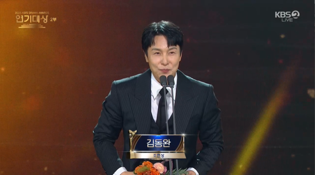 드라마 '독수리 오형제'로 조연상을 받은 김동완은 무대에 올라 뜨거운 마음을 전했다. 그는 "KBS에서 일찍 주연을 맡아 시작했지만, 마음 한구석에는 배우만 하는 사람이 아니라 늘 죄송한 마음이 있었다"며 가수 출신 배우로서의 속내를 먼저 꺼냈다.