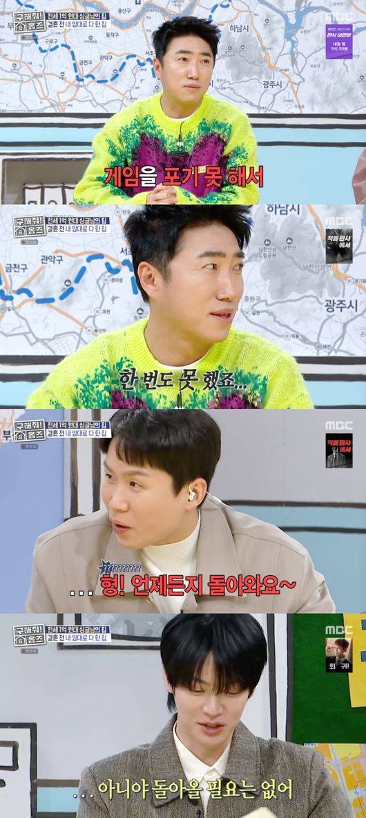 이에 다른 멤버들이 "그럼에도 포기 못 하는 것이 있냐"고 묻자, 장동민은 "게임을 포기 못해서 게임기를 거실에 딱 뒀는데 한번도 못했다"라며 결혼 이후 아이들이 태어나 마음 놓고 게임하기 어려운 현실을 짐작하게 했다. 그 순간, 양세형이 "형, 언제든 돌아와라"라고 너스레를 떨어 웃음을 더했다.